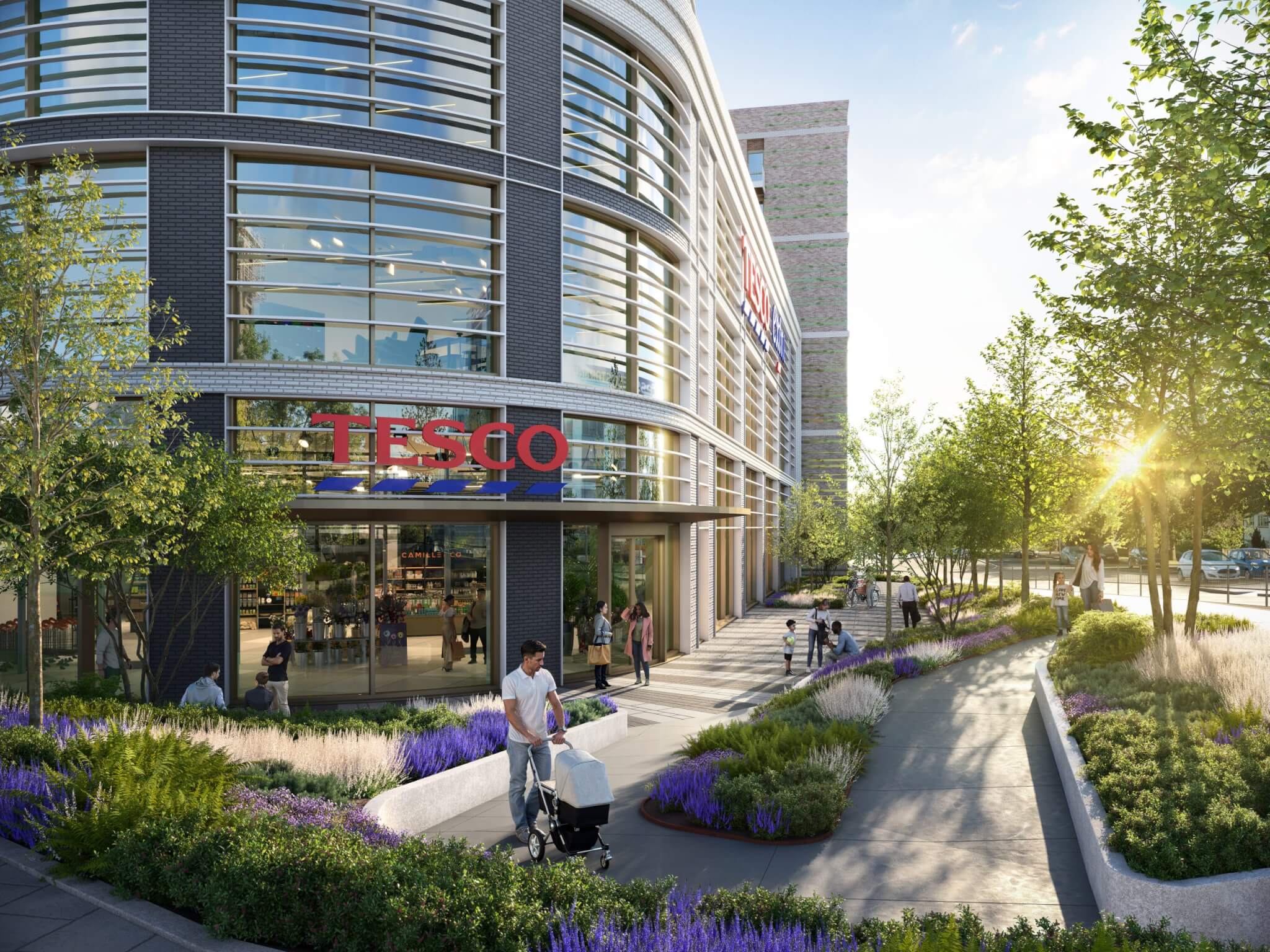 New trees and diverse shrub planting creating a greener, healthier environment, welcoming visitors to the new Tesco Extra superstore